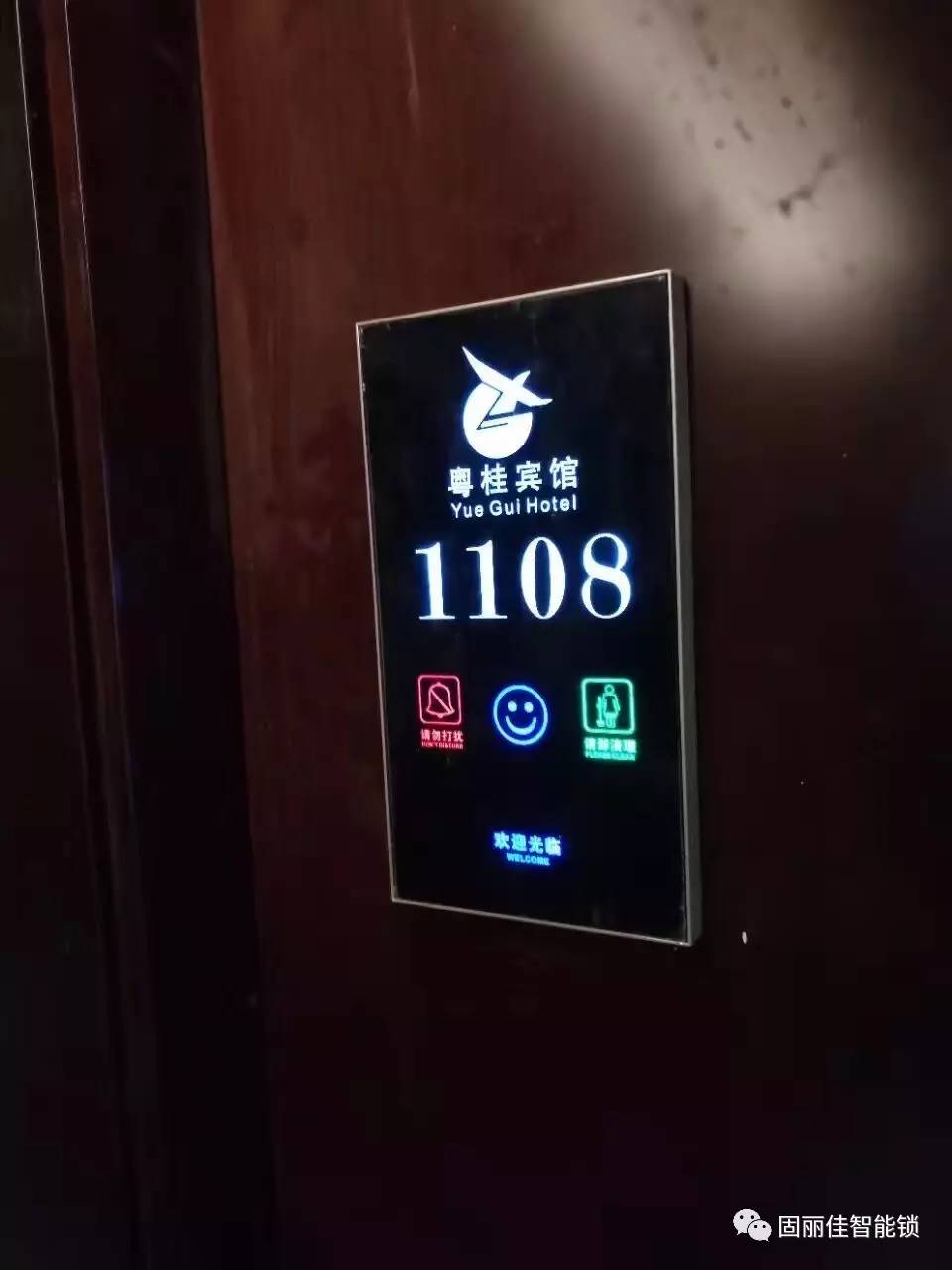 廣州粵桂賓館此次升級裝修與我們固麗科技合作安裝了固麗佳GLJ8928-FH的新穎高端款酒店電子門鎖與配套的定制電子門顯,此款酒店鎖是可以根據(jù)酒店要求定制LOGO,起到更好的展示作用;同時背面的面板設(shè)計(jì)也更加利于以后更換電池,加上精美的定制電子門顯使得酒店顯得更加的高端智能化。